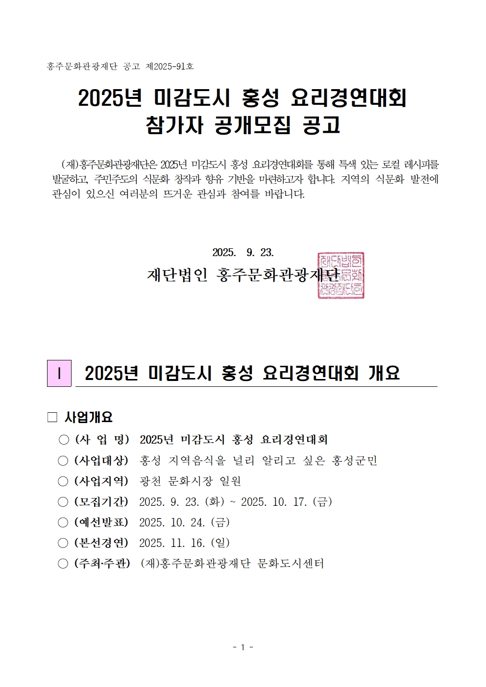 ○ 재단법인 홍주문화관광재단 문화도시센터 「2025년 대한민국 문화도시」2025년 미감도시 홍성 요리경연대회 참가자 모집과 관련하여