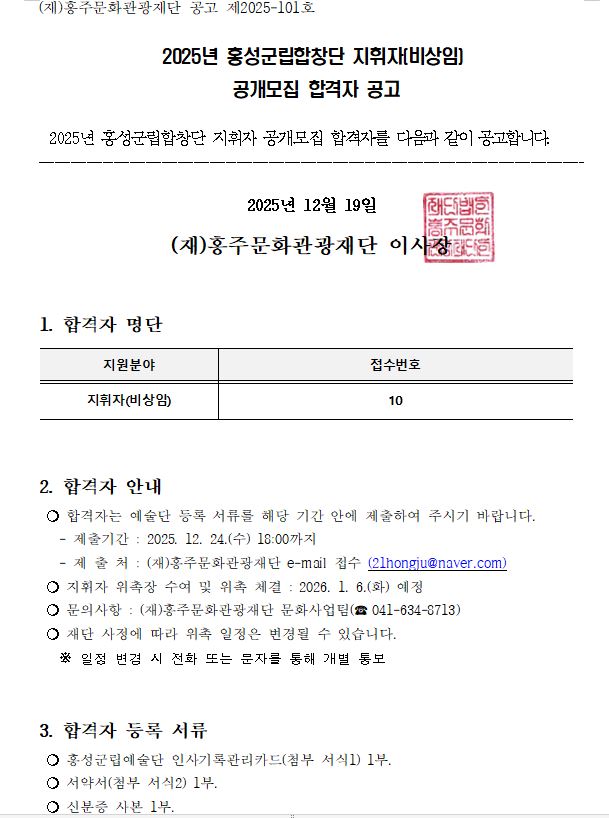 2025년 홍성군립합창단 지휘자(비상임) 공개모집 합격자 공고 작성자 : hjculture 작성날짜 : 2025-12-19 조회수 : 155 * 첨부파일 : 홍성군립예술단 인사기록관리카드 및 서약서 첨부파일 (1) 첨부. 홍성군립예술단 인사기록관리카드 및 서약서.hwp