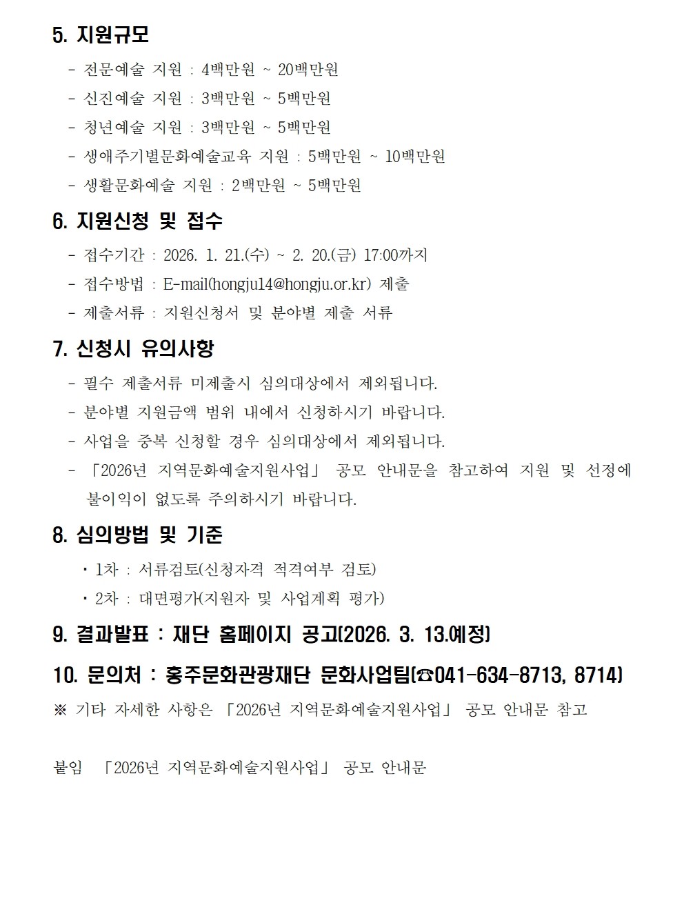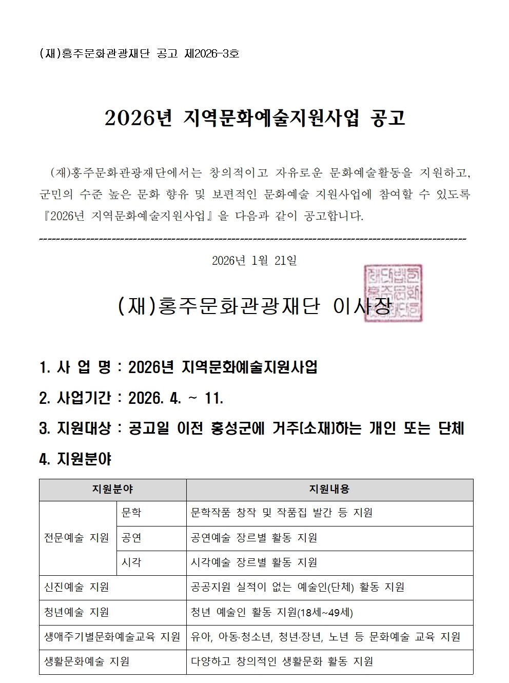 2026년 지역문화예술지원사업 공모 공고 작성자 : hjculture 작성날짜 : 2026-01-21 조회수 : 1761 첨부파일 (6) 공고 안내문(2026년 지역문화예술지원사업).pdf 공모사업 지원신청서(전문예술 지원).hwp 공모사업 지원신청서(신진예술 지원).hwp 공모사업 지원신청서(청년예술 지원).hwp 공모사업 지원신청서(생애주기별문화예술교육 지원).hwp 공모사업 지원신청서(생활문화예술 지원).hwp