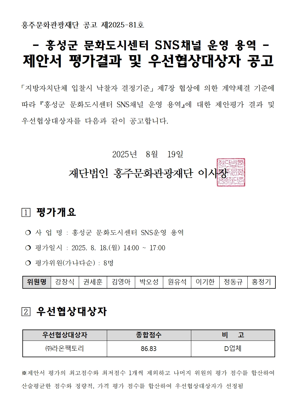 [문화도시센터] 홍성군 문화도시센터 SNS운영 용역 제안서 평가결과 및 우선협상대상자 공고