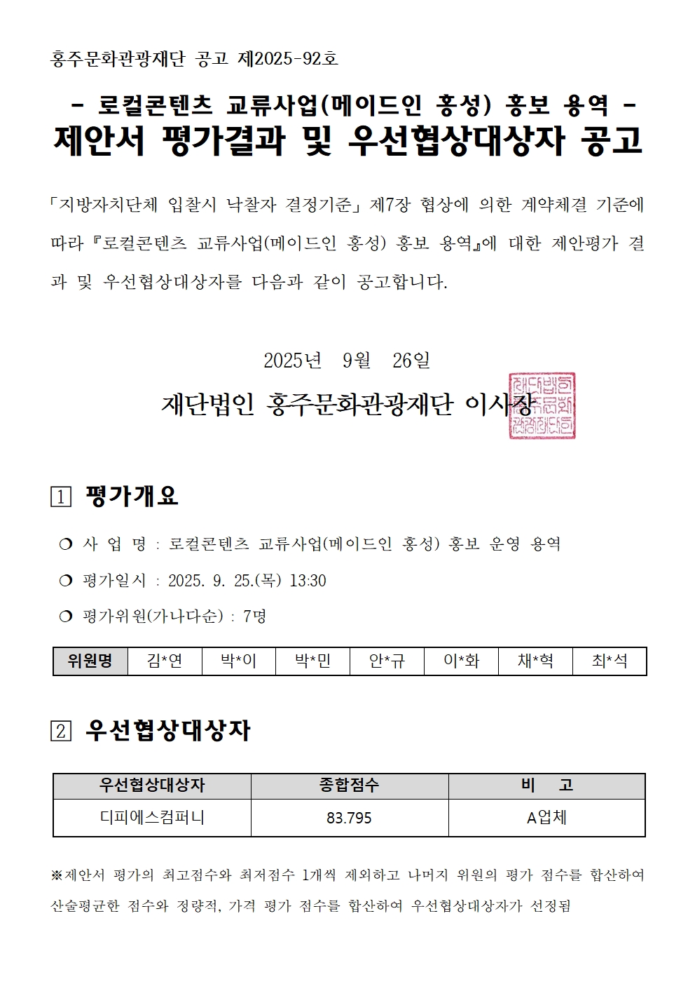 [문화도시센터]「2025년 대한민국 문화도시」로컬콘텐츠 교류사업(메이드인 홍성) 홍보 용역 우선협상대상자 공고 작성자 : hjculture 작성날짜 : 2025-09-26 조회수 : 200